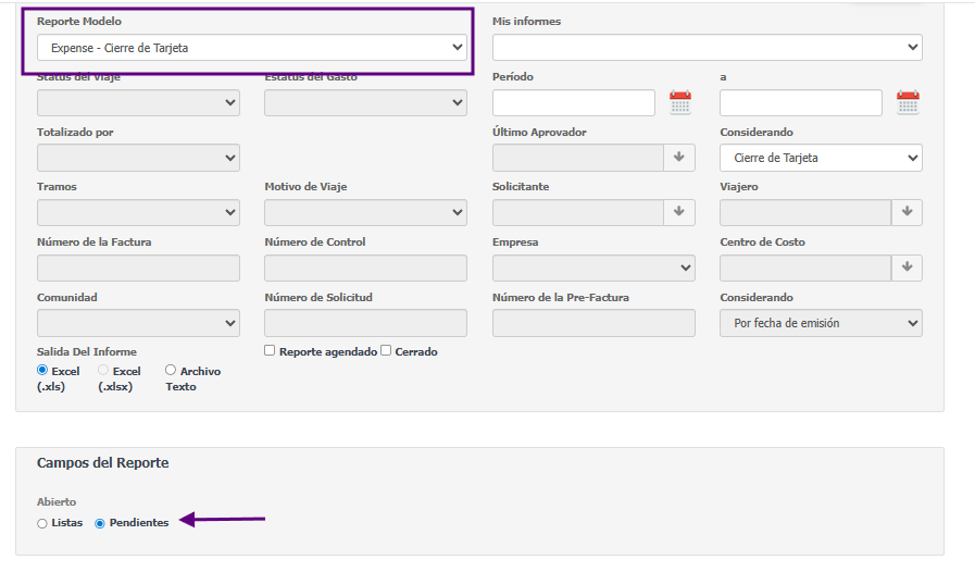 🔹 El gestor pasa a tener una visión parcial de los gastos de los colaboradores, a través del informe de Expense Cierre de Tarjeta – Pendientes o de la pantalla Facturas.