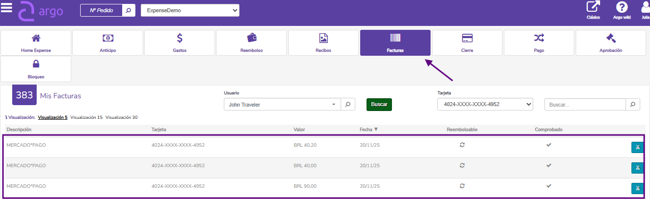 🔹 A medida que los gastos se van integrando a lo largo del mes, los colaboradores tienen visibilidad previa de los consumos importados a través de la pantalla Facturas de Argo.