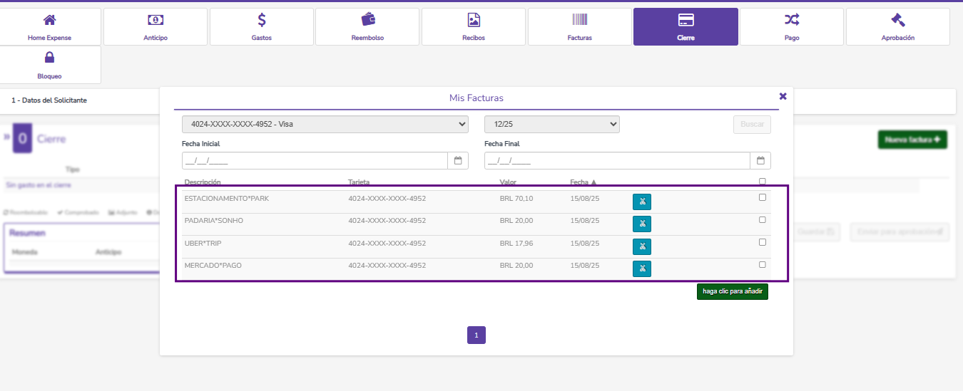 🔹 Los gastos se agrupan por la fecha de cierre, según las importaciones, evitando que los consumos se envíen para aprobación antes de tiempo, excepto en los casos previstos por la política PEAFFI.