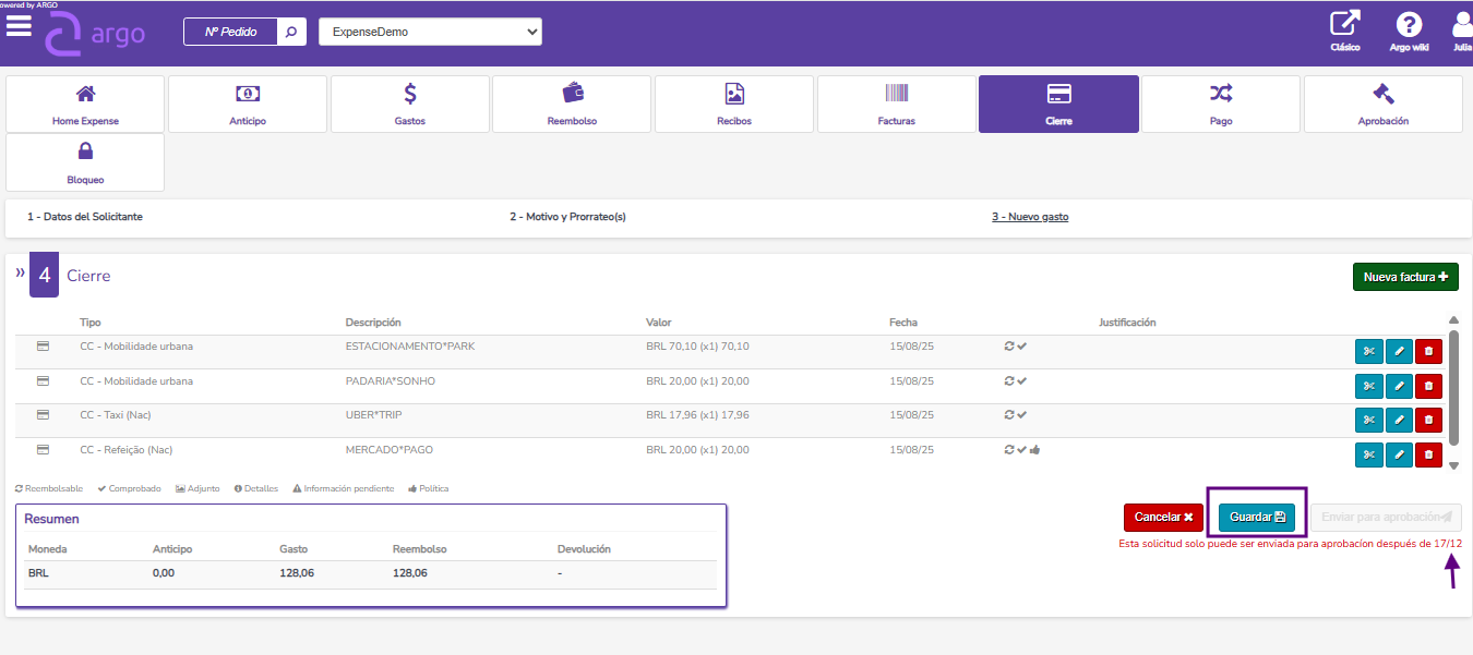 🔹 Además, es posible anticipar el proceso de justificación de gastos, ya que los consumos se importan diariamente. Aunque no está permitido enviar una factura incompleta para aprobación, el colaborador puede iniciar las justificaciones de los gastos y guardar la solicitud a lo largo del mes, conforme avanza.