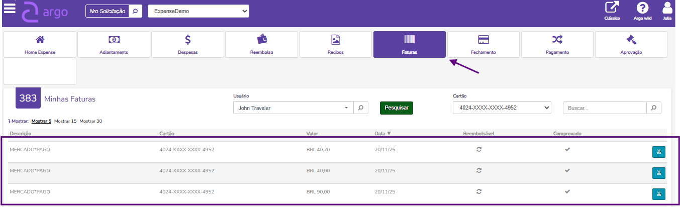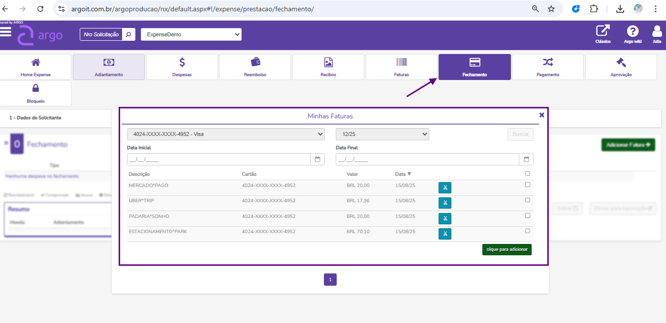 🔹Conforme as despesas vão sendo integradas ao longo do mês, os colaboradores têm visibilidade prévia dos gastos importados através da tela Faturas do Argo.