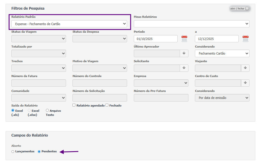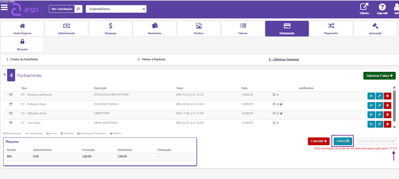 🔹Despesas são agrupadas pela data de fechamento, conforme as importações, impedindo que os gastos sejam enviados para aprovação antes da hora — exceto nos casos previstos pela política PEAFFI.