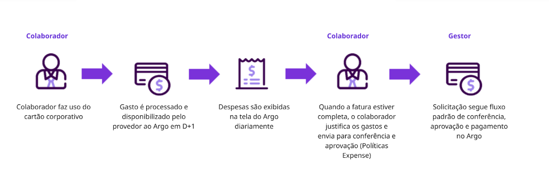 Através da integração automática de despesas, os gastos da sua corporação são integrados diariamente para o Argo, no intervalo D+1, conforme a disponibilidade do provedor de cartão.