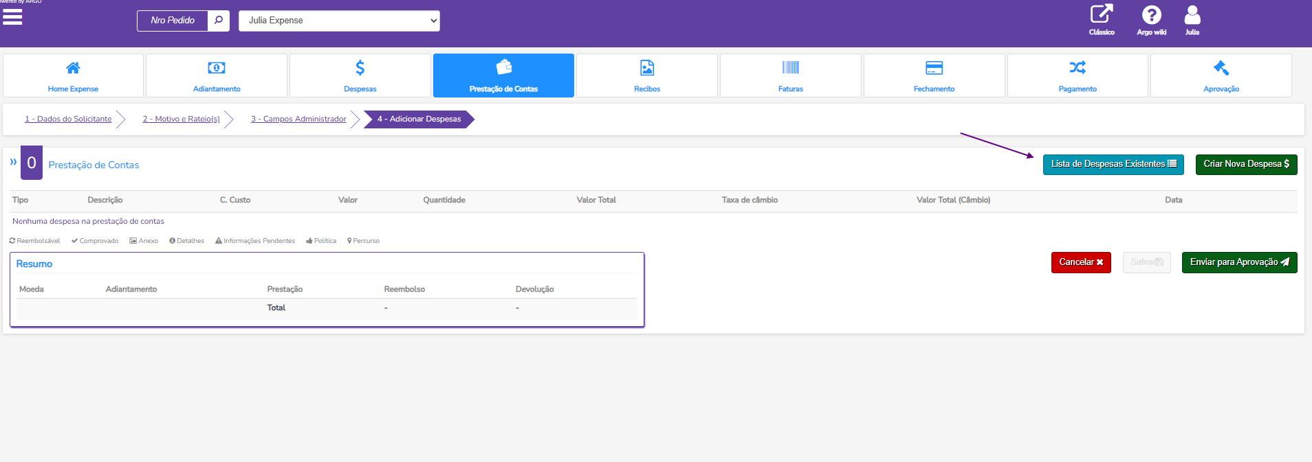 Com as despesas geradas automaticamente, o solicitante pode realizar a prestação de contas no Argo Expense a qualquer momento, seguindo o fluxo padrão do sistema.