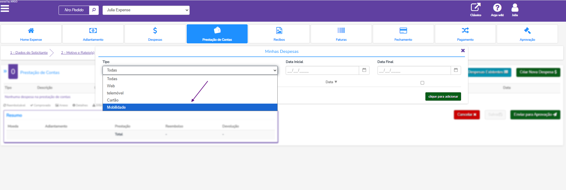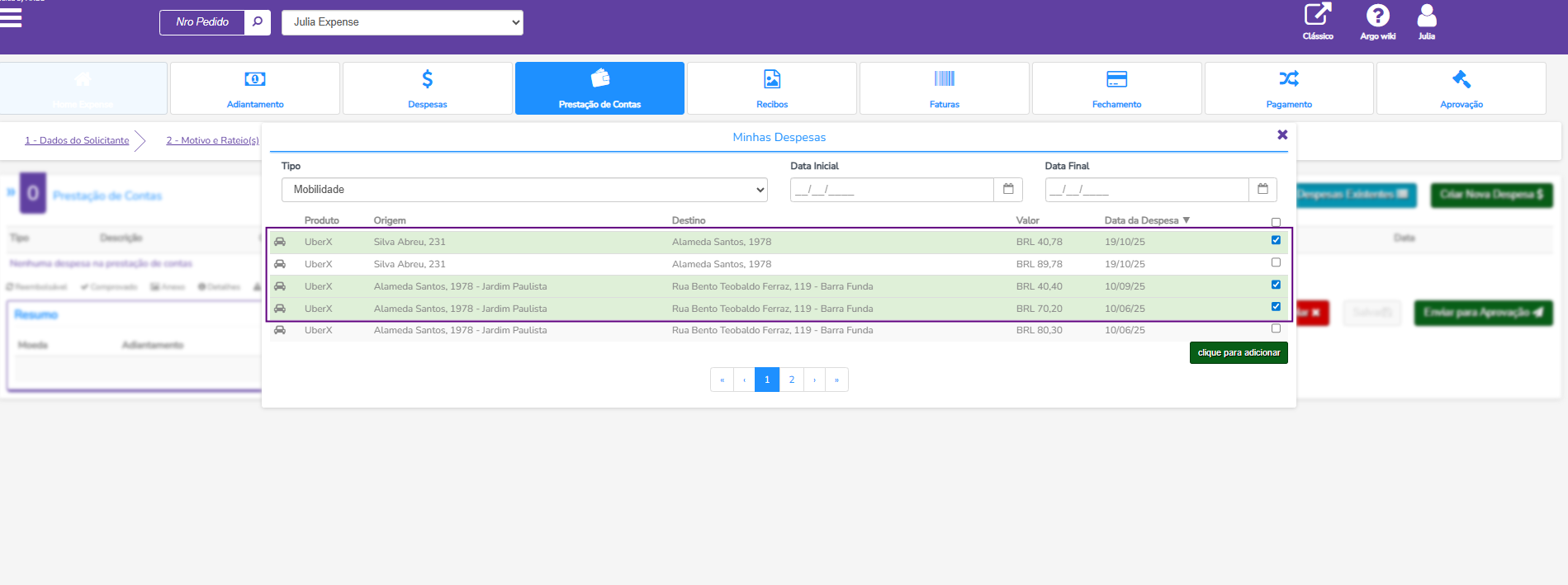 Com essa permissão habilitada, o solicitante terá acesso a uma nova opção chamada Mobilidade na Lista de Despesas Pendentes, onde serão exibidas todas as despesas criadas automaticamente via API.