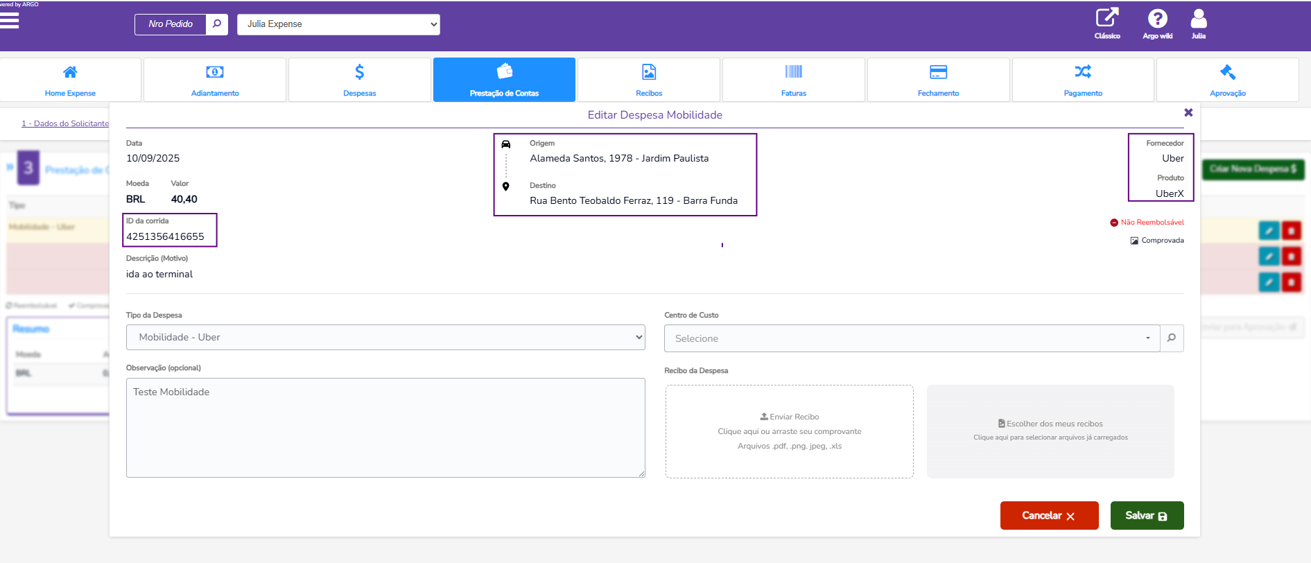 - Para justificar os gastos, o usuário terá acesso a um modal exclusivo de Mobilidade, que apresenta informações específicas, como: