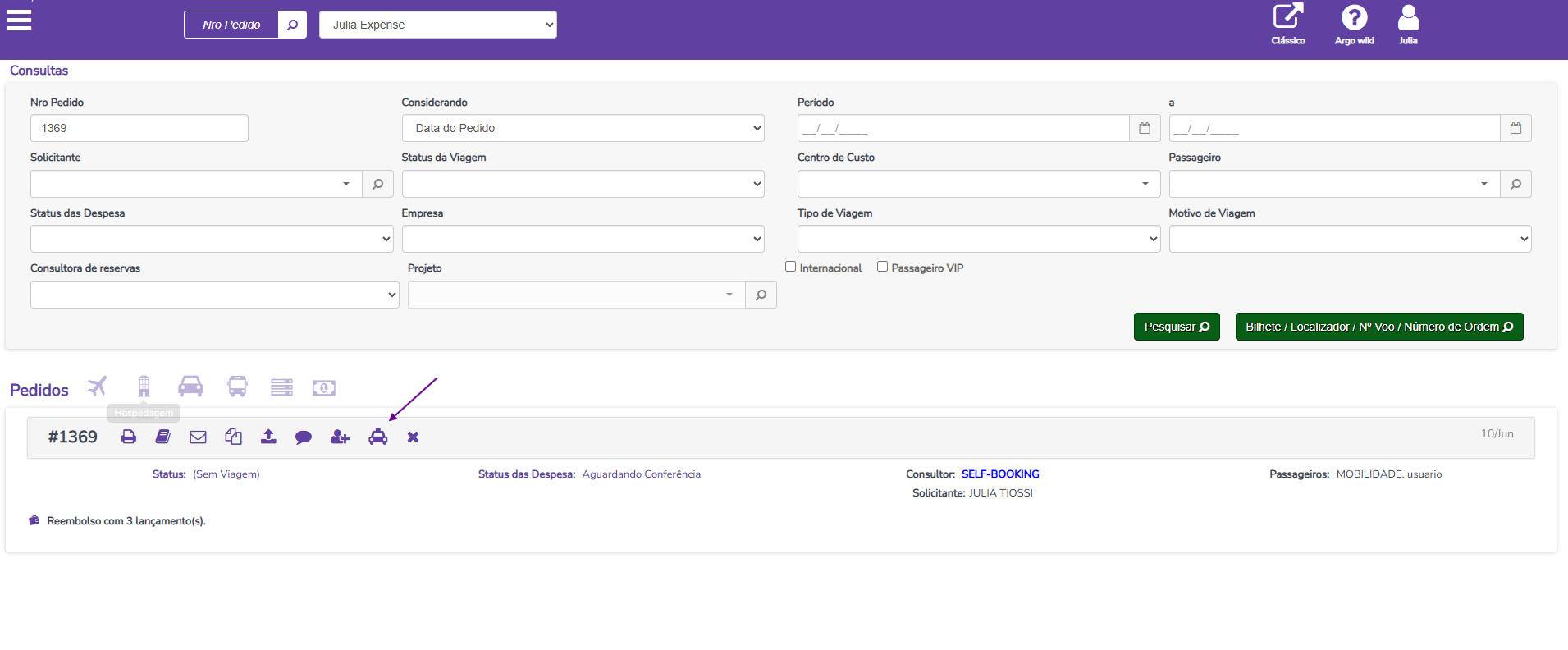 - Ao clicar nesse ícone, é possível acessar o Relatório de Mobilidade, que apresenta os principais dados dessa categoria de gastos e da solicitação;