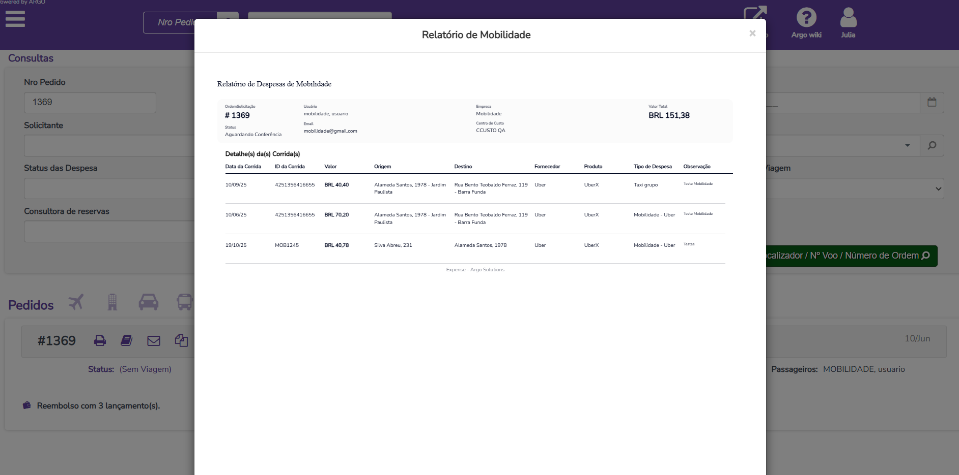 O Relatório de Mobilidade exibe exclusivamente informações relacionadas a despesas dessa categoria. Todos os usuários Argo com acesso à solicitação — solicitante, aprovador, conferente e financeiro — poderão visualizar esses dados.
