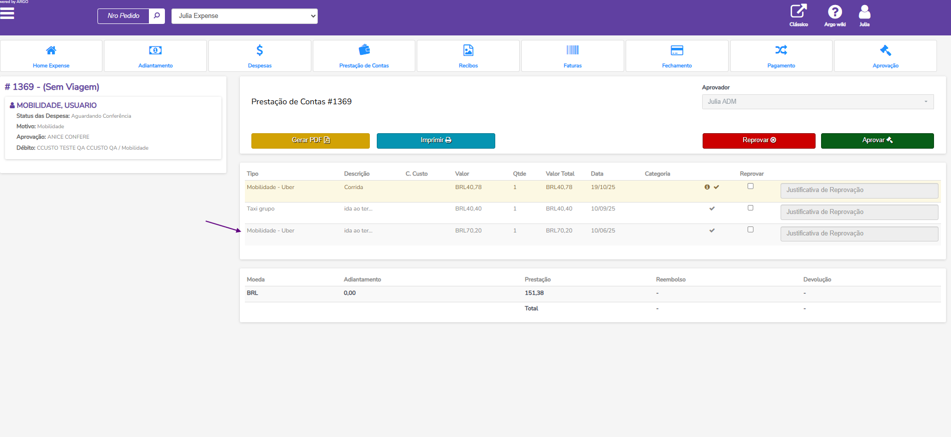 Para facilitar a identificação das prestações de contas que incluem despesas de mobilidade, o Argo Expense conta com um relatório exclusivo e uma sinalização visual dedicada.