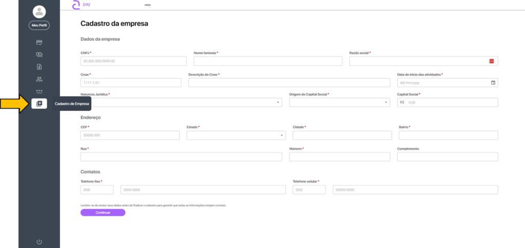Para isso, basta acessar acessar o Argo Pay e clicar na opção “Cadastro de Empresa”, no menu à esquerda.