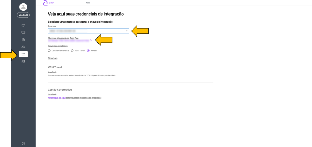 Após a aprovação por parte do parceiro, a chave de integração da ficará disponível na mesma seção “Chaves de integração”, com a diferença de que você deverá qual empresa quer visualizar: